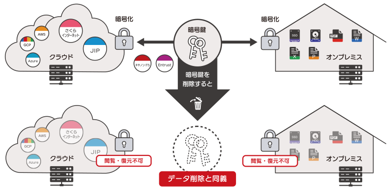 デジタル庁が推進しているガバメントクラウド(※3)と呼ばれるパブリック・クラウド環境において、保存されたデータの消去を行う場合に必要とされる、NIST SP800-88に準拠した、暗号鍵の抹消によるデータ消去(暗号化消去)を行い、かつ、そのプロセスを審査・認証することにより、生成されたログを利用した暗号化消去成立の証明が可能です。