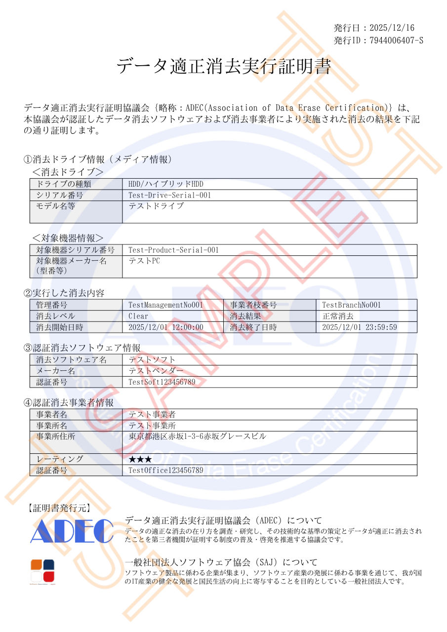 SAJデータ適正消去実行証明書発行事業